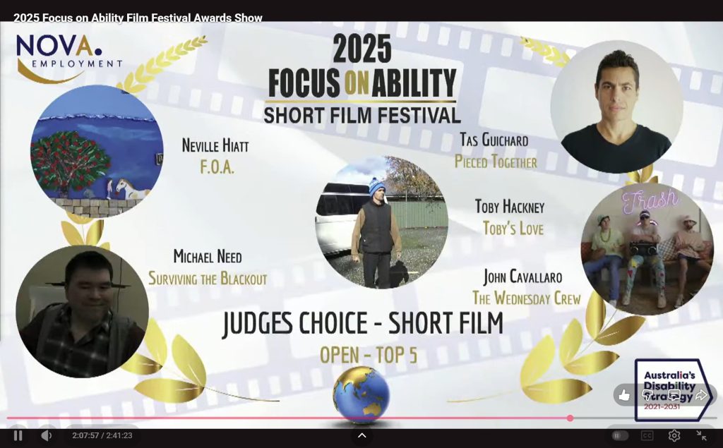 It was exciting to be a part of the red carpet awards day for the Focus On Ability Film festival and hear my name being called out as one of the top 5 as selected by the judges in the Australian open category. You can replay the livestream. Although we didn’t win the excitement hasn’t stopped there.